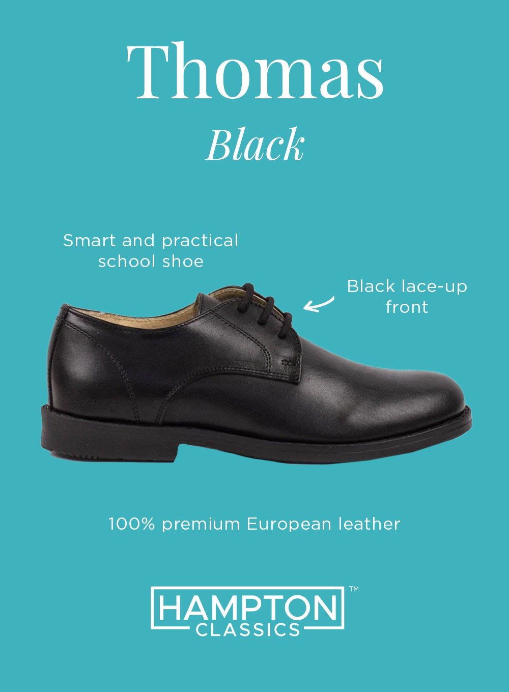 For the more mature young man, our Hampton Classics Thomas school shoes feature a black lace-up front and a slimmer sole. Made from 100% premium European leather and fully leather lined for a smart and practical look, they also feature a soft heel and ankle pad for support. Ideal for school and smart occasions, this style runs true to size.