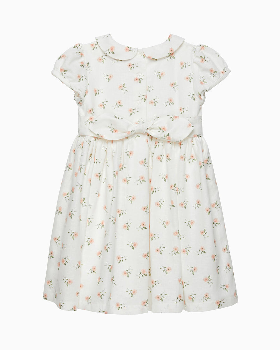 Made in a cool and light cotton linen mix, this dress has a classic shape, set against a fresh white background and adorned with a beautifully understated pink floral print. With pretty puff sleeves and a matching fabric Peter Pan collar, it comes fully lined with a complementary bow fastening and pearlised buttons at the back.