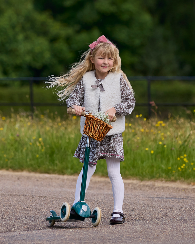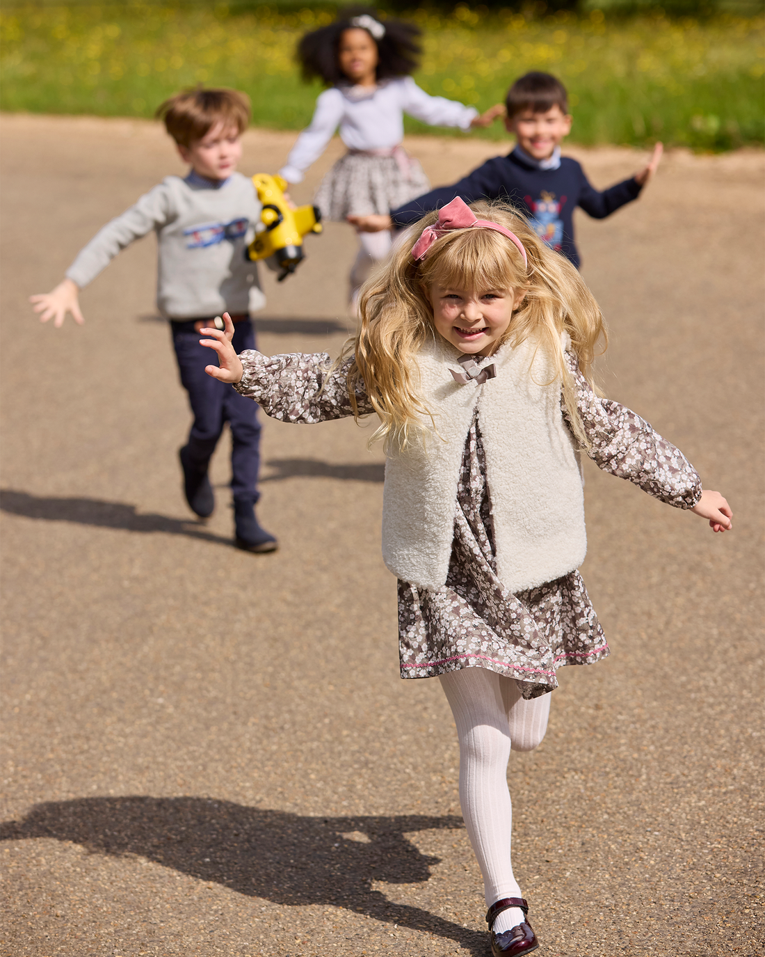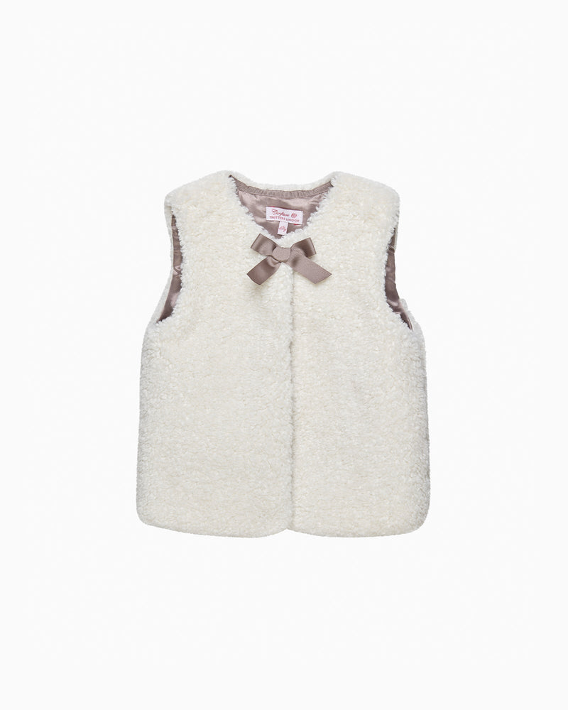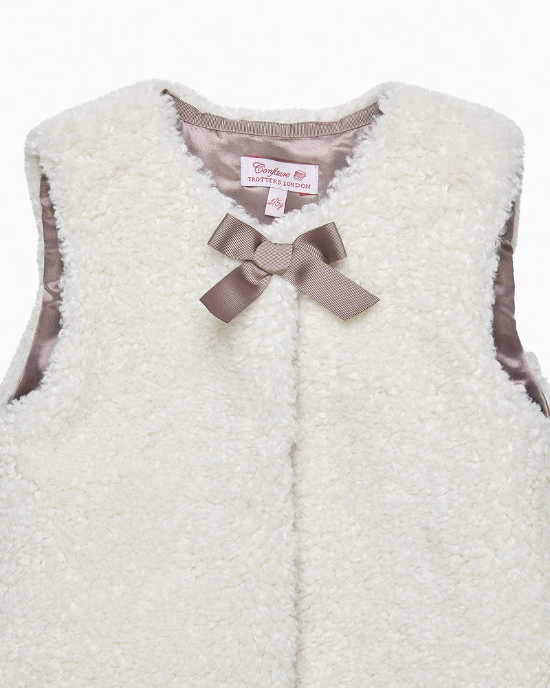 Super soft and fully lined, our brand new Mollie Gilet is lightly padded for extra warmth and finished in a chic winter white with a smart brown grosgrain bow and concealed hook fastening at the neck. Perfect for layering over our long sleeve dresses, it’s this season’s must-have.