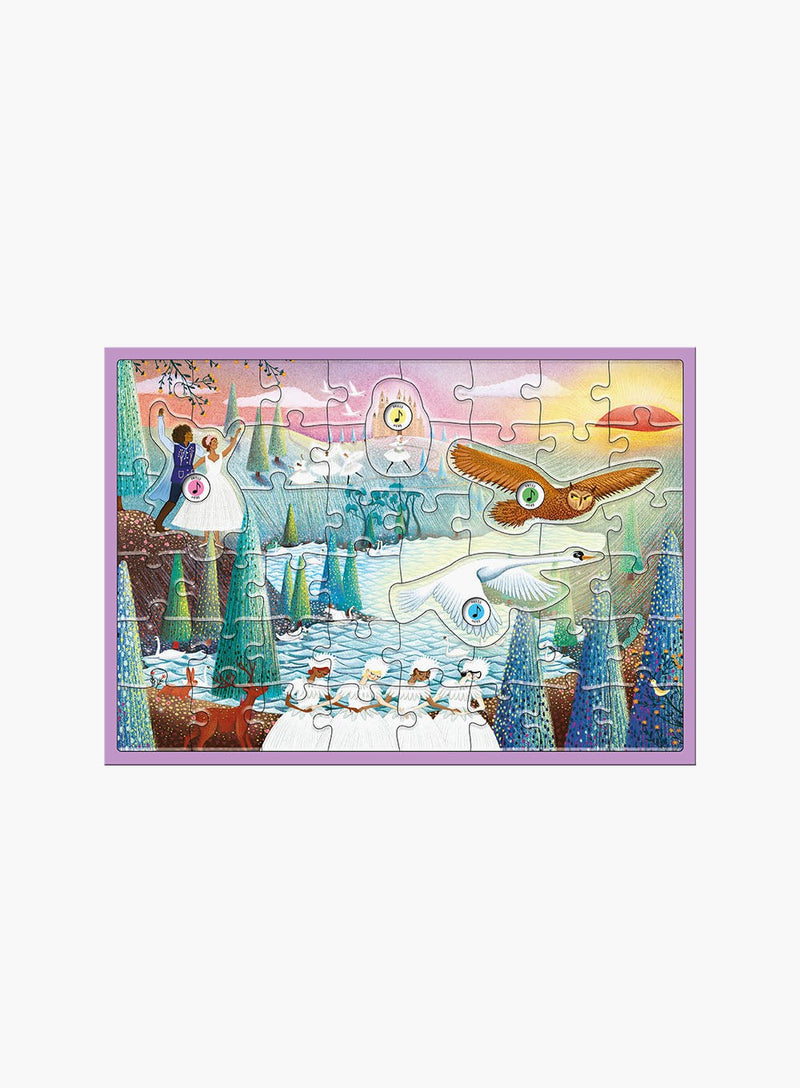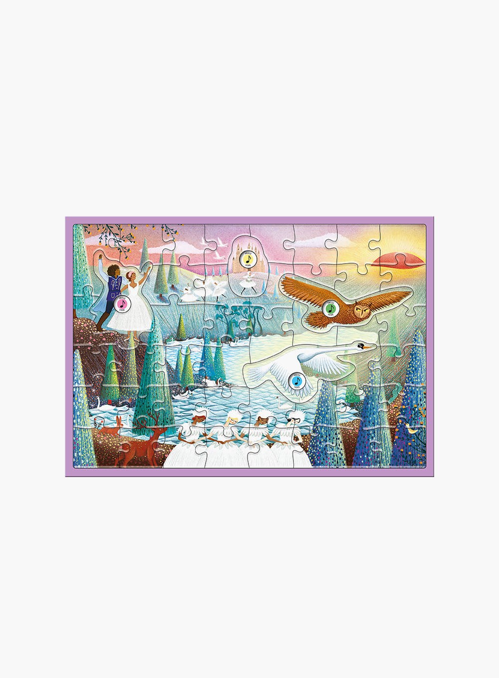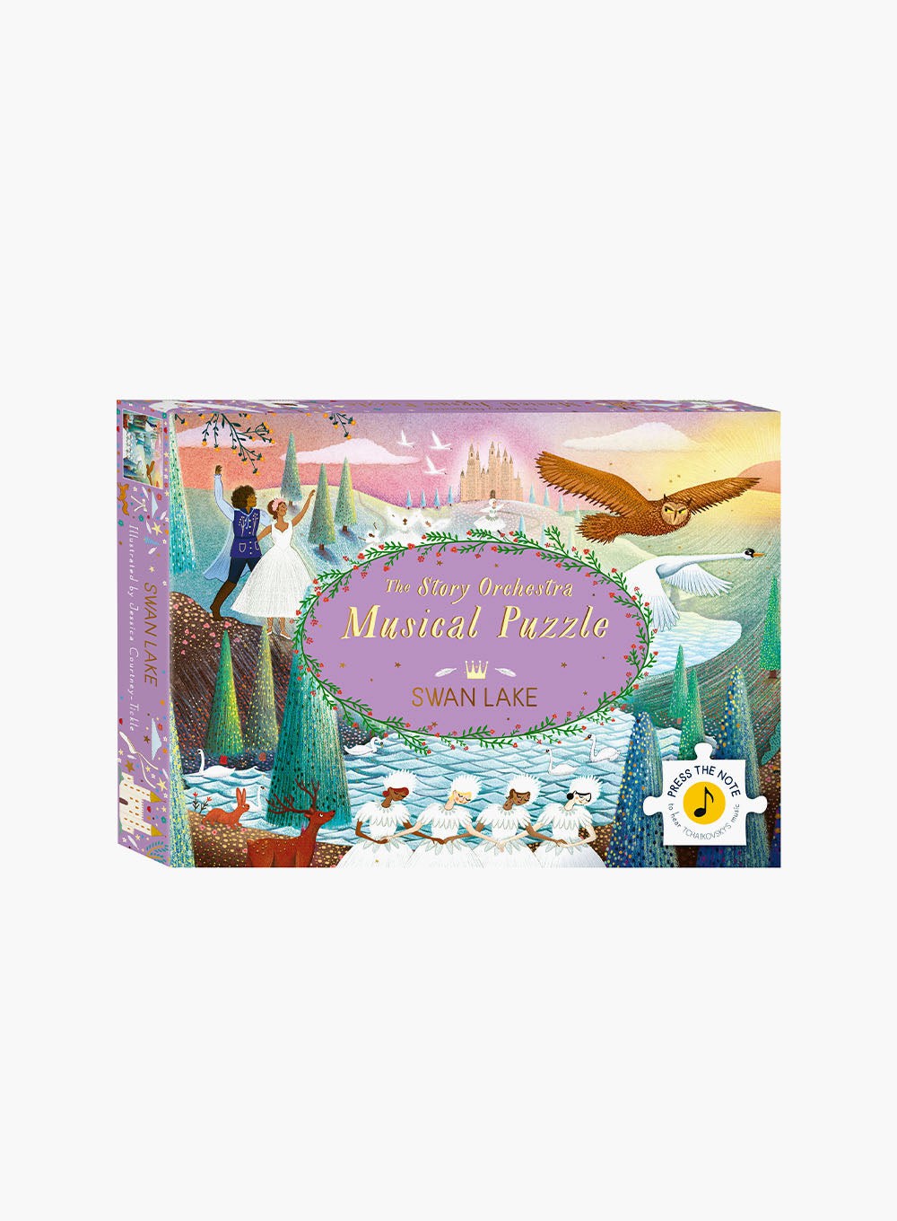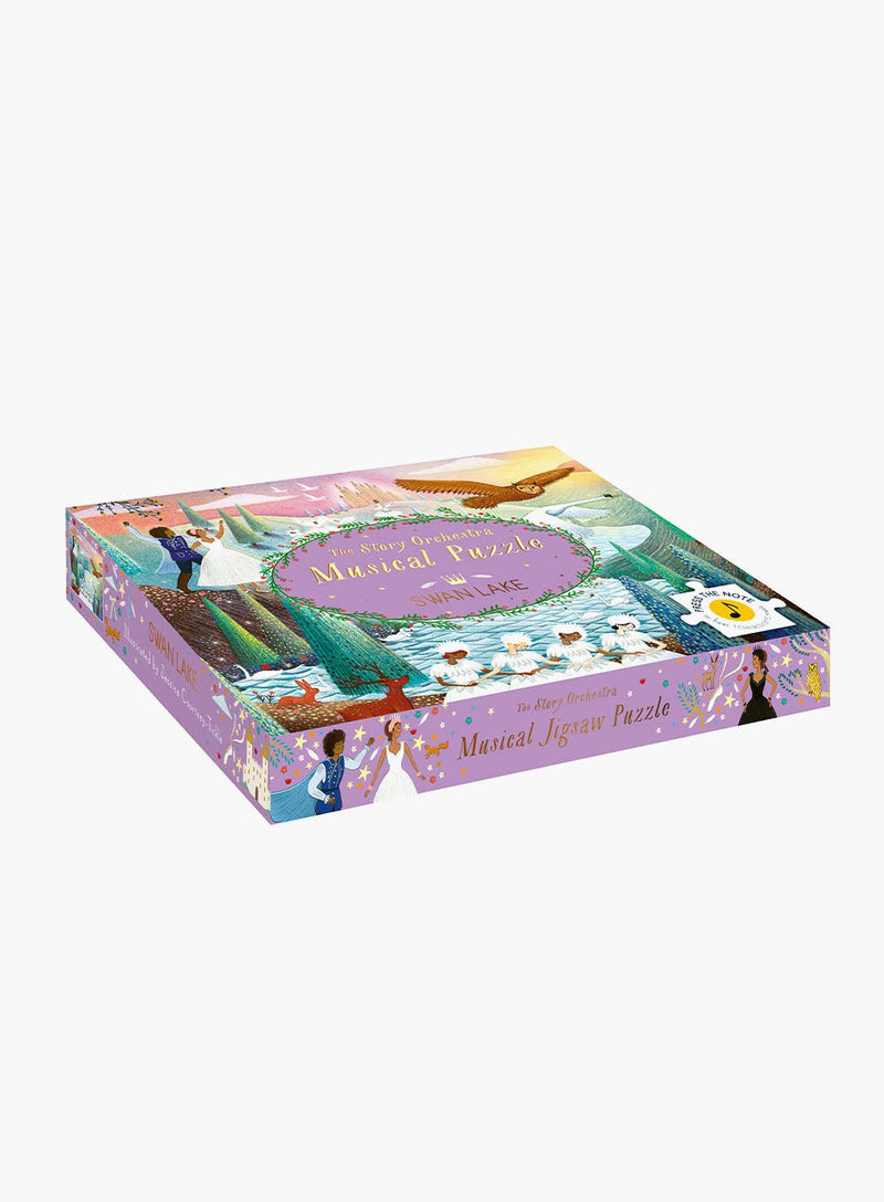 This 48-piece Swan Lake Musical Jigsaw Puzzle features four 10-second sound clips of an orchestra playing from Tchaikovsky's original score. Includes four special shaped pieces plus an educational poster featuring an abridged retelling of the story and information about the music and the composer.