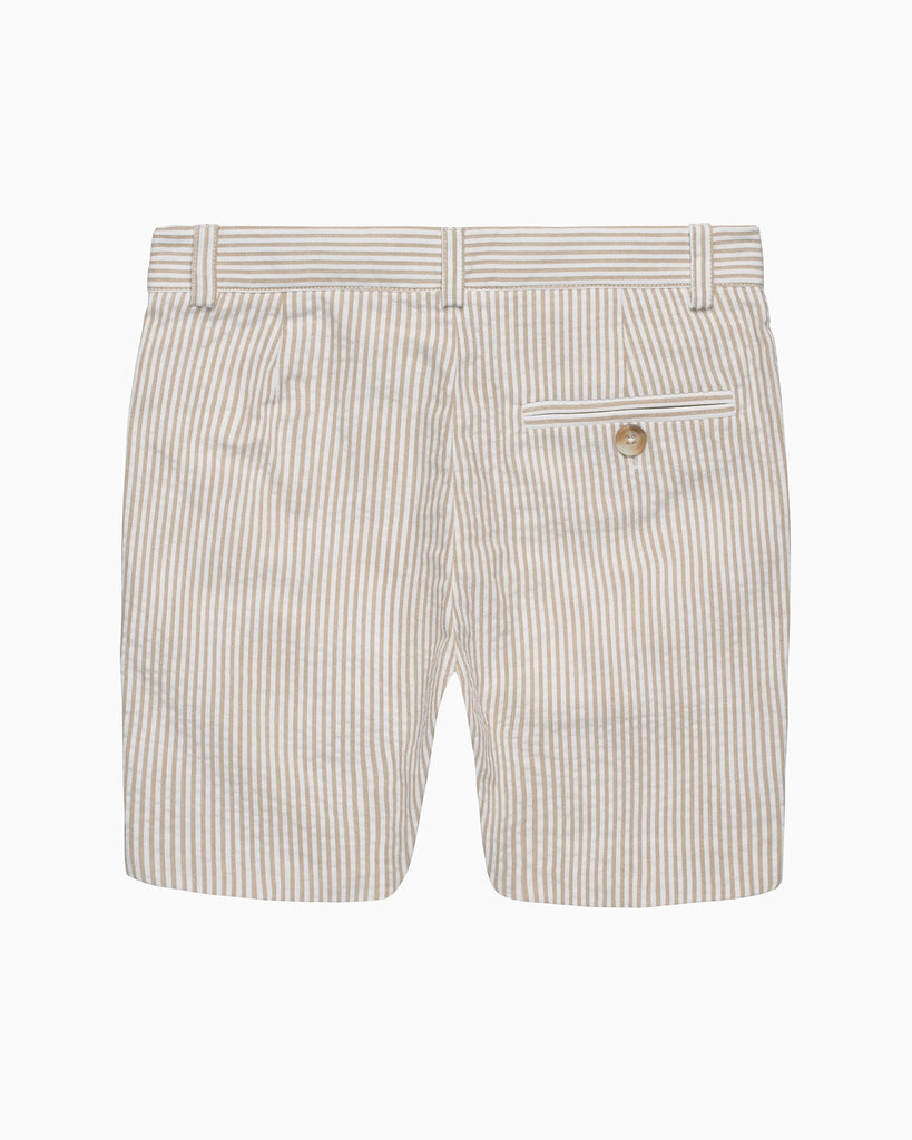 A new style this season, our Theo shorts are expertly crafted and have a smart tailored look to them. Sitting just above the knee, they come in a chic and versatile oatmeal seersucker stripe and feature mock-horn button on the front and back pockets for a premium finish. Pair with our matching blazer for the perfect special occasion outfit